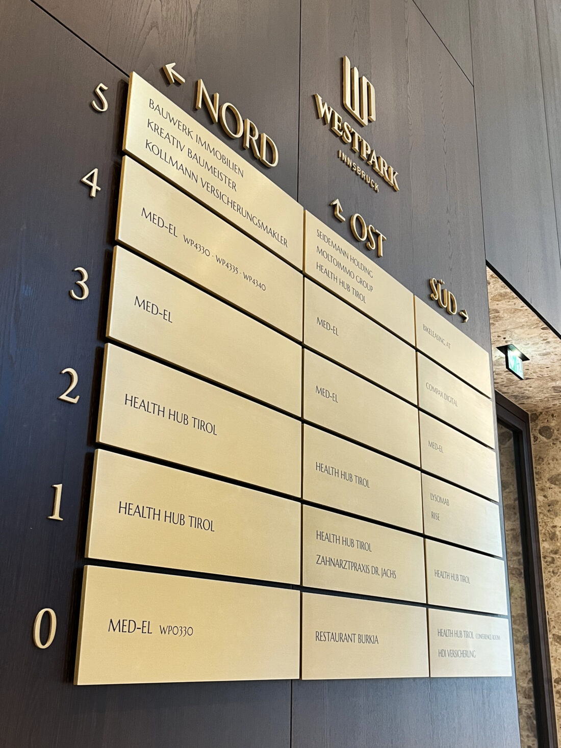Logodesign und Orientierungssystem für das multifunktionale Gebäude WestPark in Innsbruck.